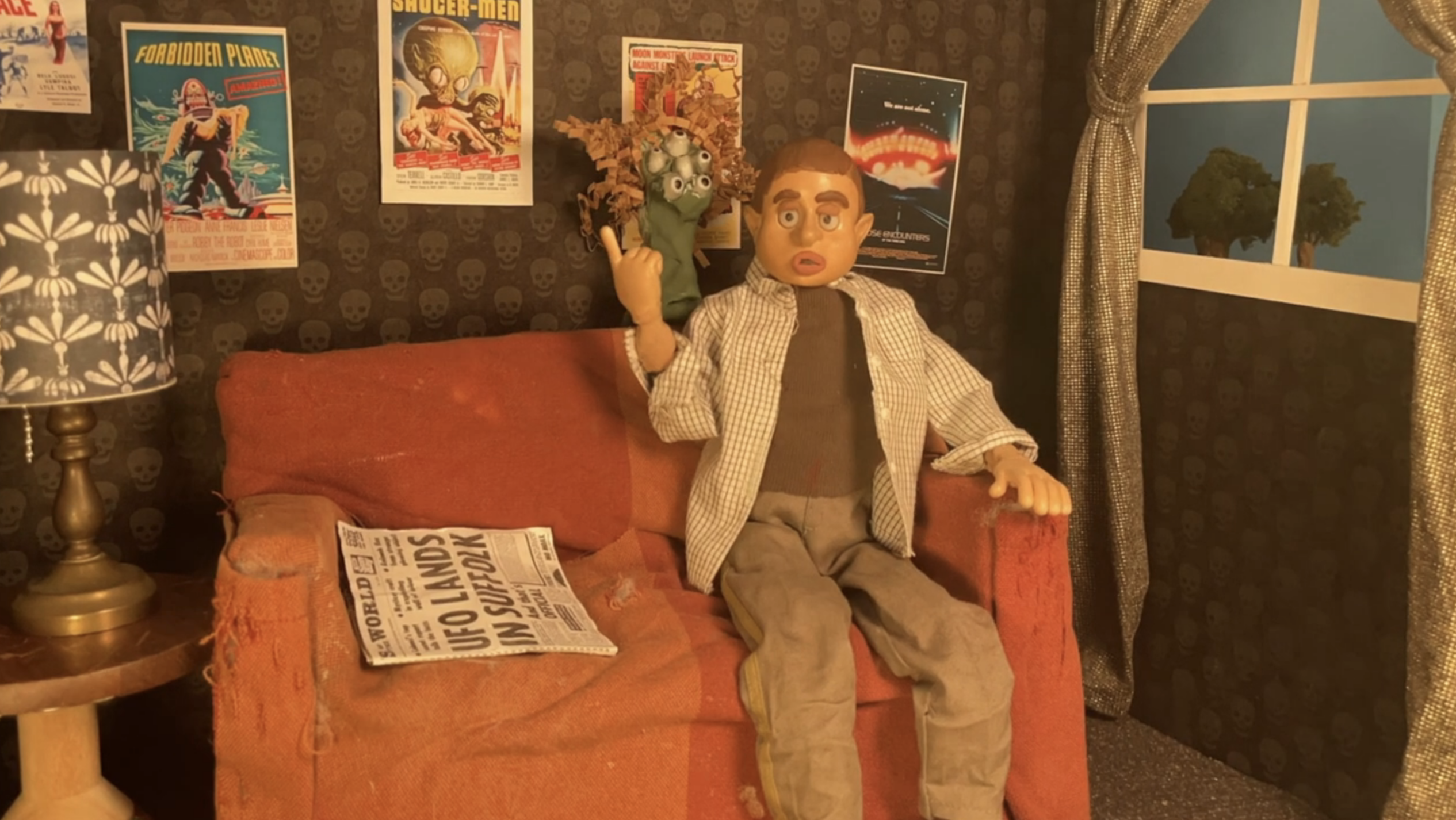 while this fella is expressing skepticism about aliens, a UFO lands outside his window and an alien sneaks in and freezes him mid-sentence